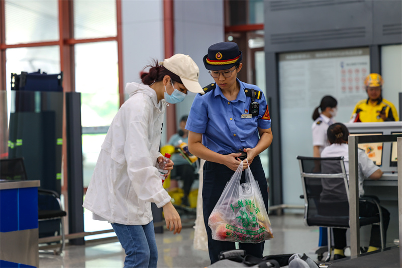 中國鐵路南昌局集團(tuán)有限公司福州車務(wù)段福清西站客運(yùn)值班員程巖在安檢口為行李多的旅客拿東西 (王勇富 攝)