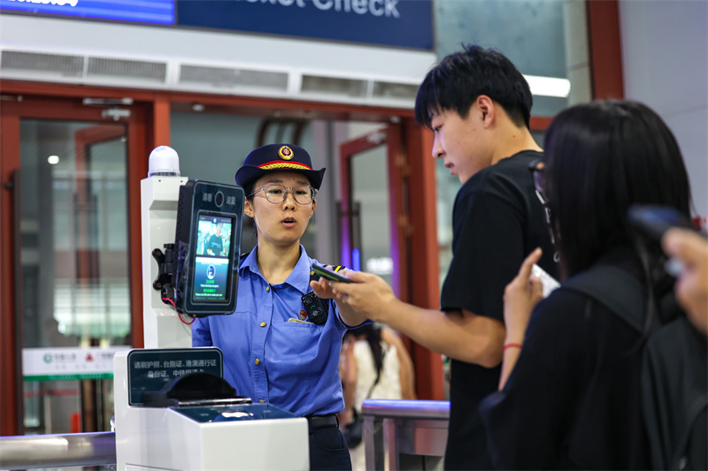 中國鐵路南昌局集團(tuán)有限公司福州車務(wù)段福清西站客運(yùn)值班員程巖在檢票口為旅客檢票核驗(yàn)信息 (王勇富 攝)