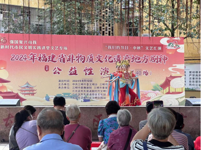 9月12日,由中共三明市委宣傳部、三明市文化和旅游局主辦,三明市歌舞劇院、列東街道新時代文明實踐所、東安社區(qū)新時代文明實踐站承辦的“我們的節(jié)日·中秋”非遺文藝演出在東安社區(qū)激情廣場舉辦,歌曲《泰寧嶺下紅山歌》《敬上客家幸福茶》、舞蹈《福往福來》等節(jié)目展現(xiàn)客家民歌、寧化木活字印刷術(shù)等非遺文化魅力。