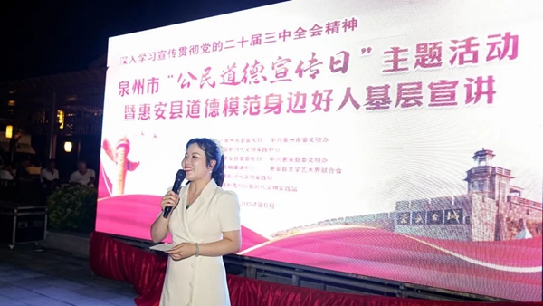 活動現(xiàn)場,宣講團成員用樸實無華卻充滿力量的語言和真摯的情感,生動地講述著福建省首屆(助人為樂類)道德模范陳欠水、福建省第七屆(誠實守信類)道德模范林和輝、泉州市第八屆(孝老愛親類)道德模范莊小虹的感人事跡。這些事跡不僅僅是關(guān)于個人的善行義舉,更是對社會主義核心價值觀的生動詮釋,激勵著人們向善向美,努力成為更好的自己。