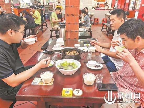 臨近中午,新華北路一帶傳來一陣陣姜母鴨的香味,游客們紛紛循香而去。走進(jìn)一家老字號店鋪,一鍋鍋姜母鴨正在烹煮,煙氣裊裊,香味撲鼻。店內(nèi)食客眾多,既有來自各地的游客,也有本地的老顧客?!傍喨怩r嫩,湯汁濃郁,真是下飯的好菜?!眮碜詮V州的蘇先生說,這是他們在泉州的第一頓正餐,一家三口都吃得十分滿意。