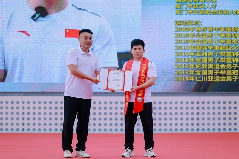 活動(dòng)現(xiàn)場(chǎng),來(lái)自同安的奧運(yùn)舉重冠軍林清峰被聘任為同安區(qū)新時(shí)代文明實(shí)踐“中央廚房”項(xiàng)目榮譽(yù)講師。