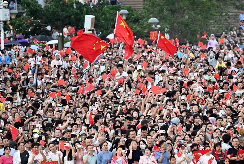 8點(diǎn)整,軍樂(lè)團(tuán)奏響雄壯的《義勇軍進(jìn)行曲》,升旗手振臂一揮,鮮艷的五星紅旗冉冉升起。全體肅立、齊聲高唱國(guó)歌,目送五星紅旗升至旗桿頂端。全場(chǎng)響起掌聲和歡呼聲,大家揮舞著手中的國(guó)旗,由衷表達(dá)對(duì)祖國(guó)的熱愛(ài)。