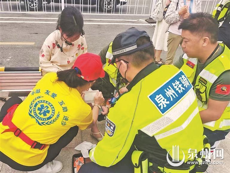 驛站里,穿著馬甲的幾名志愿者異常醒目,他們是泉州市急救指揮中心志愿服務隊的志愿者。昨日13時許,帶隊的阮文花與志愿者劉利平、朱洪紅、林小薇,為一撥前來咨詢的游客提供服務后,才打開快餐,準備吃午餐。他們剛吃了幾口,一名男子就一瘸一拐地走到服務臺前。原來,來自廣東揭陽的林先生,在蟳埔的巷子里不小心崴了左腳,他在家人的攙扶下來驛站尋求幫助。阮文花和志愿者停下午餐,打開急救包,找到噴霧劑,為他噴藥止疼?!昂枚嗔?、好多了?!绷窒壬B連道謝。