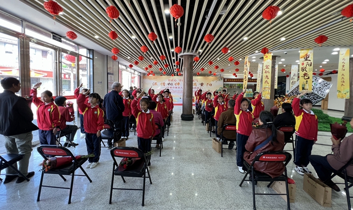 10月10日,在屏南縣新時代文明實踐中心,光華小學學生為各社區(qū)的空巢老人代表敬獻獻花