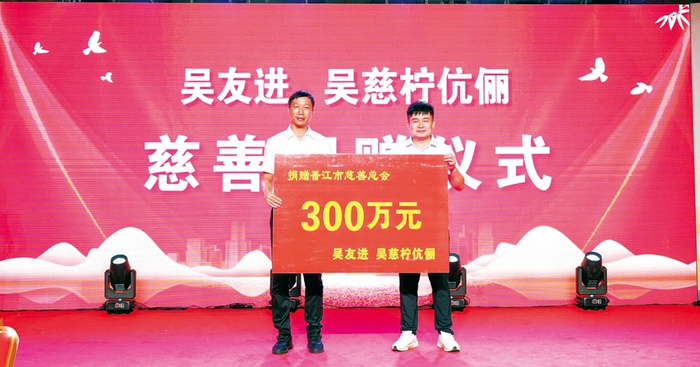 為老人發(fā)紅包的,正是帶頭踐行移風(fēng)易俗新風(fēng)尚的磁灶鄉(xiāng)賢吳友進、吳慈檸伉儷。他們不但取消了長女吳靜怡的16周歲生日宴,還向晉江市慈善總會捐贈了300萬元。