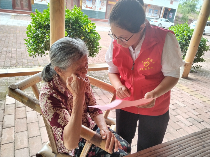 志愿者向村民宣傳相關(guān)政策