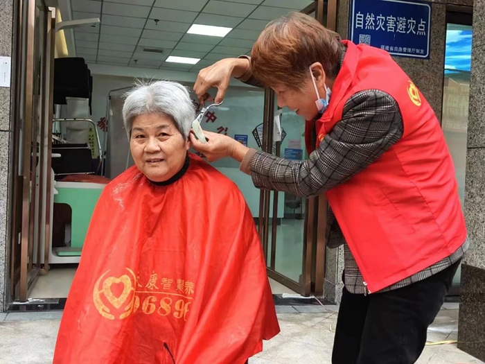 福隆社區(qū)新時(shí)代文明實(shí)踐站志愿者正在為居民剪頭發(fā)。