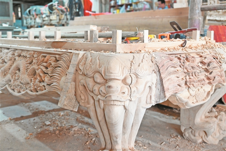 走進位于金涵鄉(xiāng)的蕉城非遺傳承人賴奶楊木雕工廠內(nèi),空氣中散發(fā)著一股木質(zhì)香,形態(tài)各異的木雕作品整齊擺放,賴奶楊正向旁人展示龍形木構(gòu)件的雕刻過程,盡顯嫻熟技藝。
