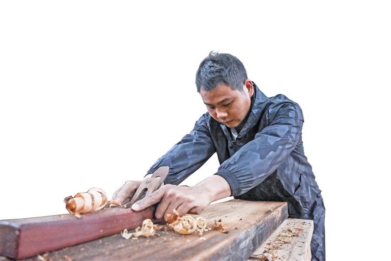 木構(gòu)件雕刻完成后,賴奶楊對其進行細致打磨、拋光。“打磨是一項很重要的工序,讓木雕表面更加光滑、自然?!辟嚹虠钫f。