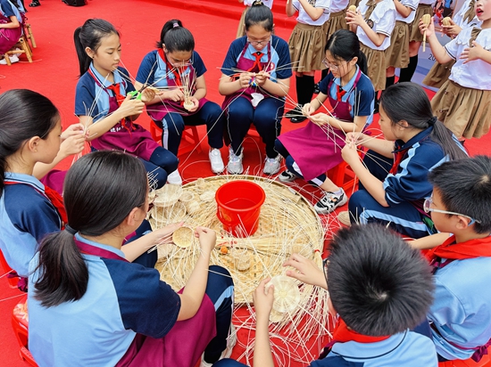 2023年6月13日,福建省大中小學(xué)勞動(dòng)教育推進(jìn)會(huì)現(xiàn)場,安溪縣第二十小學(xué)學(xué)生們演示非遺竹藤編技藝。安溪縣委文明辦 供圖
