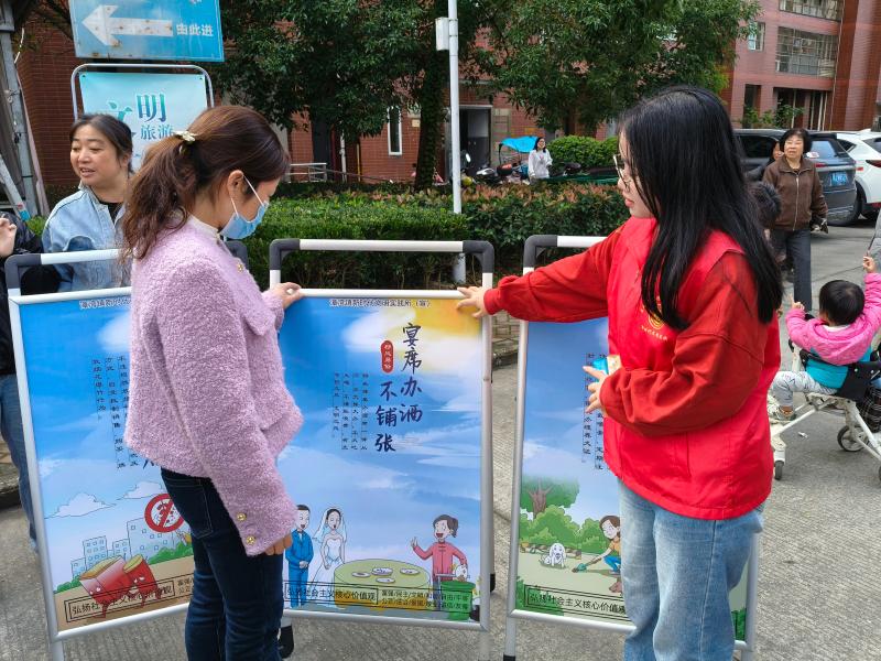 活動(dòng)當(dāng)天,金馬小區(qū)門口人頭攢動(dòng),氣氛熱烈。志愿者在小區(qū)的顯眼位置懸掛著醒目的橫幅,上面書(shū)寫(xiě)著“抵制高額彩禮,倡導(dǎo)文明婚俗”“牽好‘文明繩’,養(yǎng)犬‘不掉鏈’”“喪事簡(jiǎn)辦揚(yáng)正氣,厚養(yǎng)薄葬樹(shù)新風(fēng)”等宣傳標(biāo)語(yǔ)。這些橫幅不僅傳遞了移風(fēng)易俗的重要性,也吸引了眾多居民駐足觀看,并激發(fā)了他們參與文明建設(shè)的熱情。