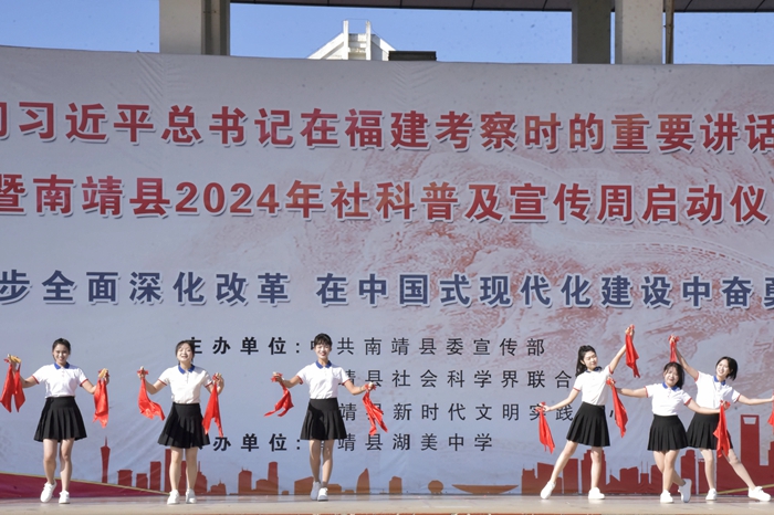 文明風(fēng)12月4日訊 “習(xí)總書記來福建,殷切期望記心間。扭住目標(biāo)不放松,一張藍圖繪到底……”山城鎮(zhèn)“荊城頌”宣講隊朗朗上口的快板聲回蕩在南靖縣湖美中學(xué)的操場上,近日,學(xué)習(xí)貫徹習(xí)近平總書記在福建考察時的重要講話精神宣講活動暨南靖縣2024年社科普及宣傳周啟動儀式在湖美中學(xué)舉行。