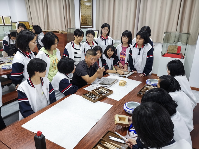 福建省建陽第一中學(xué)教師在向?qū)W生傳授建本雕刻和印刷知識 建陽區(qū)教育局供圖