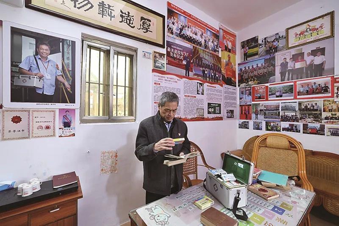 潘秀欽在家中整理小藥箱。30多年來,他將藥箱帶在身邊,以便為他人提供應急救助。陳斌 攝