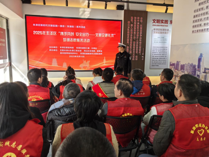 文明風(fēng)1月13日訊 為深入學(xué)習(xí)貫徹習(xí)近平總書記關(guān)于社會主義精神文明建設(shè)的重要講話精神,日前,豐澤區(qū)新時代文明實踐一條街(東湖街)共建單位共同舉辦了“攜手共創(chuàng) 安全出行——文明交通禮儀”培訓(xùn)志愿服務(wù)暨“倡導(dǎo)移風(fēng)易俗 推行文明殯葬”宣傳活動。此次活動旨在通過多方合作,共同提升公眾的交通安全意識,推廣文明交通行為,并倡導(dǎo)文明殯葬新風(fēng),進一步推動城市文明建設(shè)。