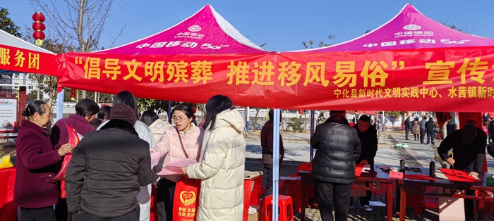文明風(fēng)1月14日訊 為破除喪葬陋習(xí),引導(dǎo)廣大干部群眾樹(shù)立厚養(yǎng)薄葬、文明節(jié)儉治喪、節(jié)地生態(tài)安葬、文明綠色祭掃等理念,擯棄大操大辦、厚葬薄養(yǎng)等不良風(fēng)氣和陳規(guī)陋習(xí)。1月14日,結(jié)合2025年寧化縣文化科技衛(wèi)生“三下鄉(xiāng)”活動(dòng),寧化縣新時(shí)代文明實(shí)踐中心、水茜鎮(zhèn)新時(shí)代文明實(shí)踐所聯(lián)合在水茜鎮(zhèn)集鎮(zhèn)開(kāi)展“倡導(dǎo)文明殯葬 推進(jìn)移風(fēng)易俗”主題宣傳活動(dòng)。