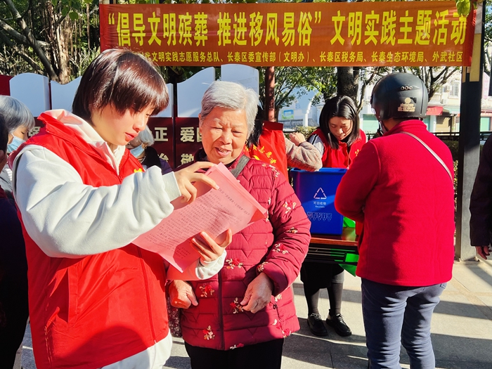 文明風(fēng)1月17日訊 春節(jié)將至,為進(jìn)一步弘揚(yáng)文明新風(fēng),推進(jìn)殯葬改革,倡導(dǎo)文明節(jié)儉治喪、節(jié)地生態(tài)安葬、綠色低碳祭掃的文明殯葬新風(fēng),近日,長泰區(qū)新時(shí)代文明實(shí)踐中心、武安鎮(zhèn)外武社區(qū)新時(shí)代文明實(shí)踐站在武安鎮(zhèn)外武公園聯(lián)合開展“倡導(dǎo)文明殯葬 推進(jìn)移風(fēng)易俗”文明實(shí)踐主題活動(dòng)。