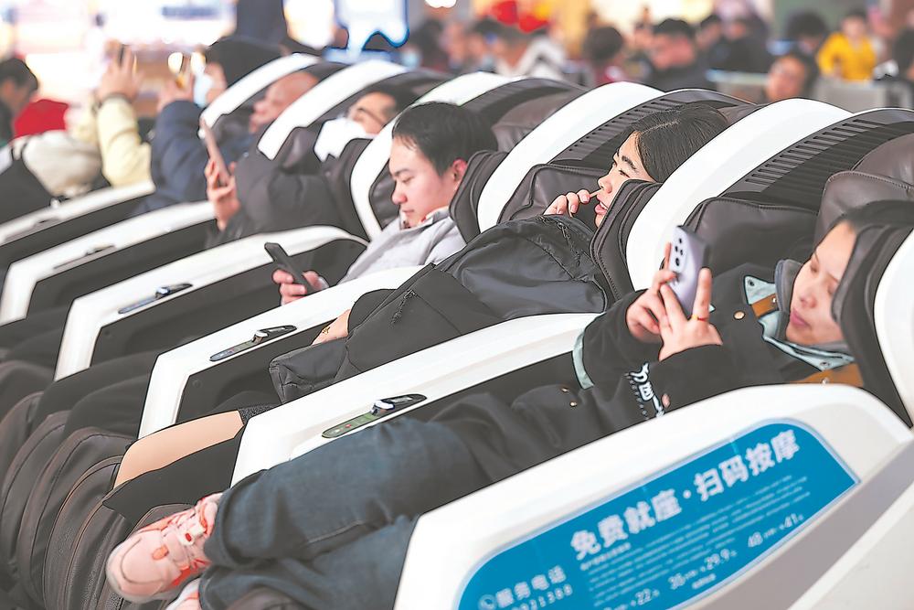 2025年1月15日,乘客躺在福州火車站的按摩椅上候車。施辰靜 攝