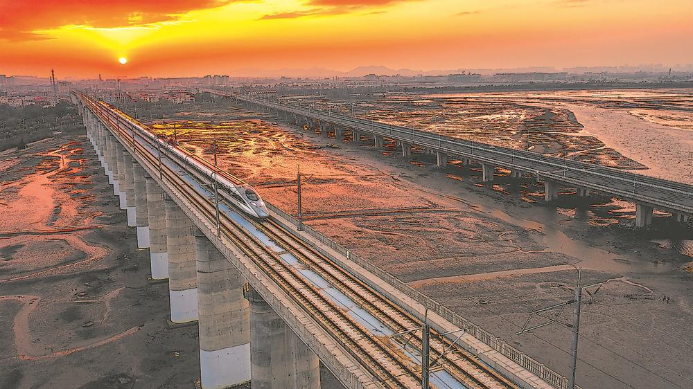 2024年12月19日傍晚,動(dòng)車組駛過福廈高速鐵路線上的泉州灣跨海大橋。福廈高鐵是我國首條設(shè)計(jì)時(shí)速350公里的跨海高鐵。四通八達(dá)的高速鐵路網(wǎng)絡(luò)大大縮短了時(shí)空距離,讓回家的路更加便捷舒適。顏華杰 攝
