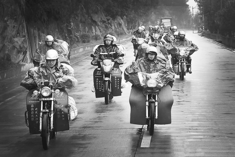 2013年2月5日,閩北山區(qū)公路,返鄉(xiāng)的在榕務(wù)工人員在雨霧中騎行。由于火車票難買,“摩托車大軍”成為當(dāng)時(shí)春運(yùn)的一道特殊風(fēng)景。肖春道 攝