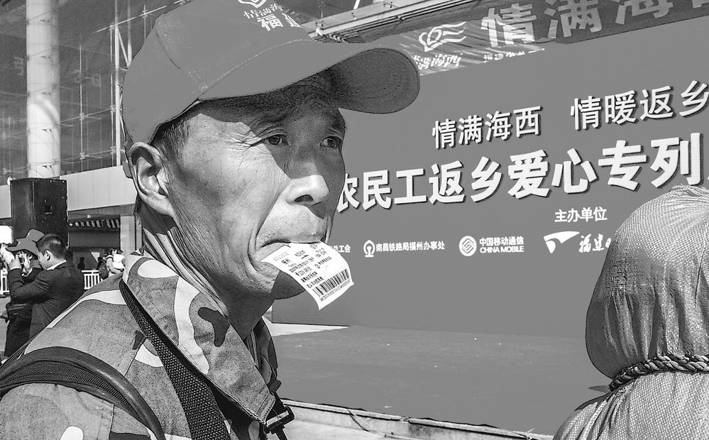 2009年1月15日,福州火車站,一名四川農(nóng)民工領(lǐng)到了愛心火車票。當(dāng)年春運(yùn)期間,福建日?qǐng)?bào)社與福建省總工會(huì)等單位共同組織開通農(nóng)民工返鄉(xiāng)愛心專列,幫助農(nóng)民工順利回家過年。 楊婀娜 攝