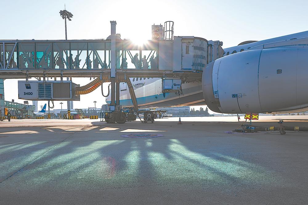 2025年1月13日,福州長樂國際機(jī)場,旅客在冬日暖陽里登機(jī)。王毅 攝