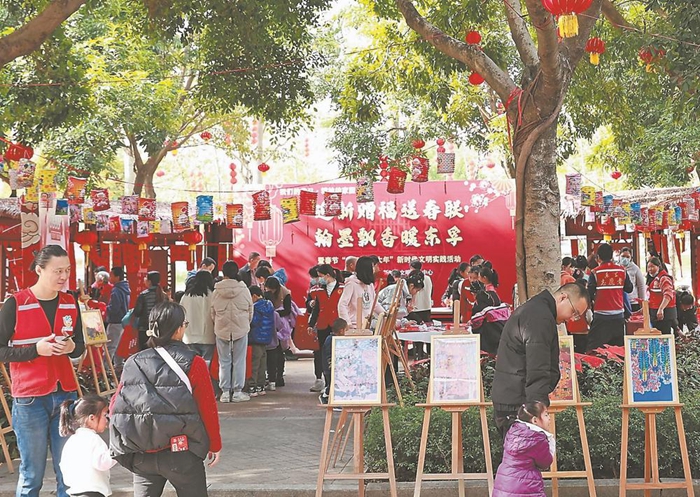 市民在海滄區(qū)東孚街道新時(shí)代文明實(shí)踐所中心廣場欣賞年畫作品。