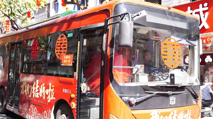 大紅喜字、結(jié)婚條幅、卡通婚紗照……這些喜慶的裝扮讓平日里“沉穩(wěn)”的公交車搖身一變,成為了新人的“幸福專列”。