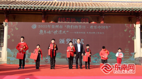 泉州市志愿者協(xié)會會長賴暢水為當選”泉年味 世遺風——年俗少年說“生肖ip代言人頒獎。 張鈺琪 攝