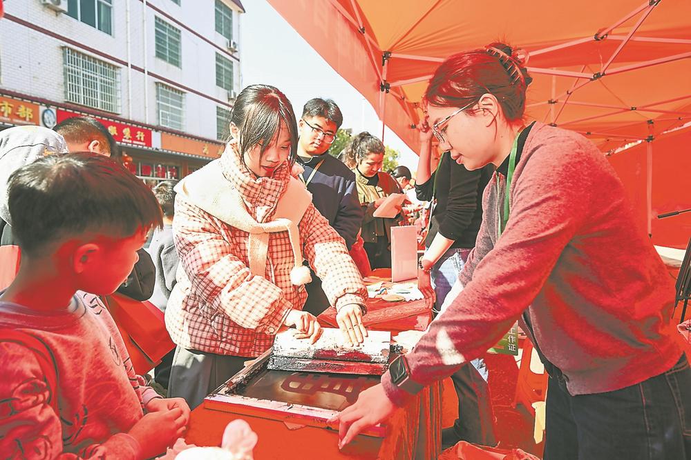 活動現場,展現我省優(yōu)秀傳統(tǒng)文化的服務點吸引不少群眾駐足。中都鎮(zhèn)是中國民間文化藝術之鄉(xiāng)、中華詩教單位,文化氛圍濃厚也成了今年“三下鄉(xiāng)”活動的顯著特點。