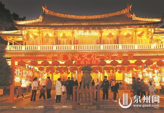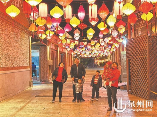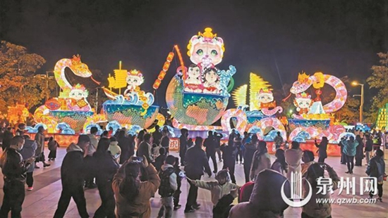 在蟳埔民俗文化村,20米長的創(chuàng)意魚形燈組、簪花冰雕燈等令人眼前一亮。頭戴簪花的蛇形花燈、拍胸舞花燈等,將泉州海絲、民俗文化等元素融入其中。在南少林文武坊,花燈同樣亮點(diǎn)十足。農(nóng)歷正月十四至十八,這里不僅能賞燈,還能參加僑家樂美食交流活動。真武廟前廣場及通道布置了50余盞傳統(tǒng)花燈和1座新年特色景觀座燈,還有藝術(shù)家文創(chuàng)游園市集、戲曲展演、元宵猜燈謎等互動活動。