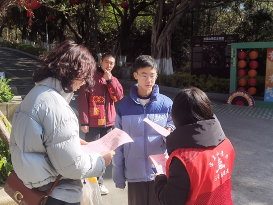 石獅寶蓋山景區(qū)工作人員向游客發(fā)放《文明旅游倡議書》,進(jìn)行文明引導(dǎo)