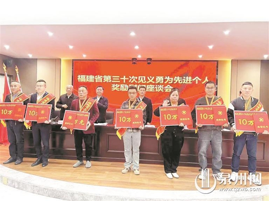 2月17日,福建省第三十次見義勇為先進個人獎勵慰問座談會在泉州舉行,會上表揚獎勵了泉州市7名見義勇為先進個人。省見義勇為獎勵和保護工作委員會副主任、省見義勇為基金會理事長李應(yīng)良,省見義勇為基金會副理事長兼秘書長朱永合,泉州市副市長、市公安局局長、市見義勇為人員獎勵和保護工作委員會主任肖進才,市公安局黨委委員、政治部主任劉南輝及熱心見義勇為公益事業(yè)的企業(yè)代表、特步集團董事長丁金潮,百川集團董事長張飛鵬等出席,泉州市見義勇為協(xié)會會長柳新群主持。