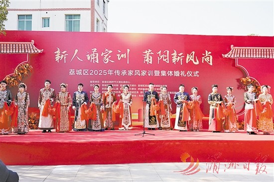 年初,一場“新人誦家訓(xùn)莆陽新風(fēng)尚”荔城區(qū)2025年傳承家風(fēng)家訓(xùn)暨集體婚禮在省級傳統(tǒng)村落、莆田著名的“進(jìn)士村”東陽村舉行。10對新人誦庭訓(xùn)、行拜堂之禮、交換信物、共飲合巹茶,共乘水上巴士,傳統(tǒng)禮儀與時代新風(fēng)交融,婚事簡辦不減愛。