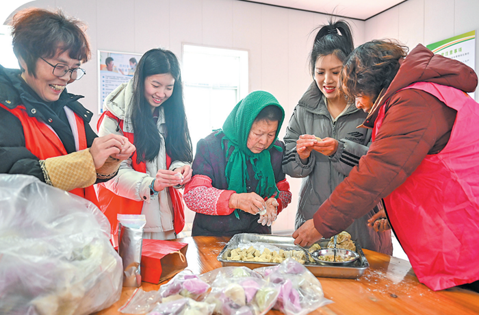 在大厝基村幸福院,村民和志愿者一起包拗九丸。