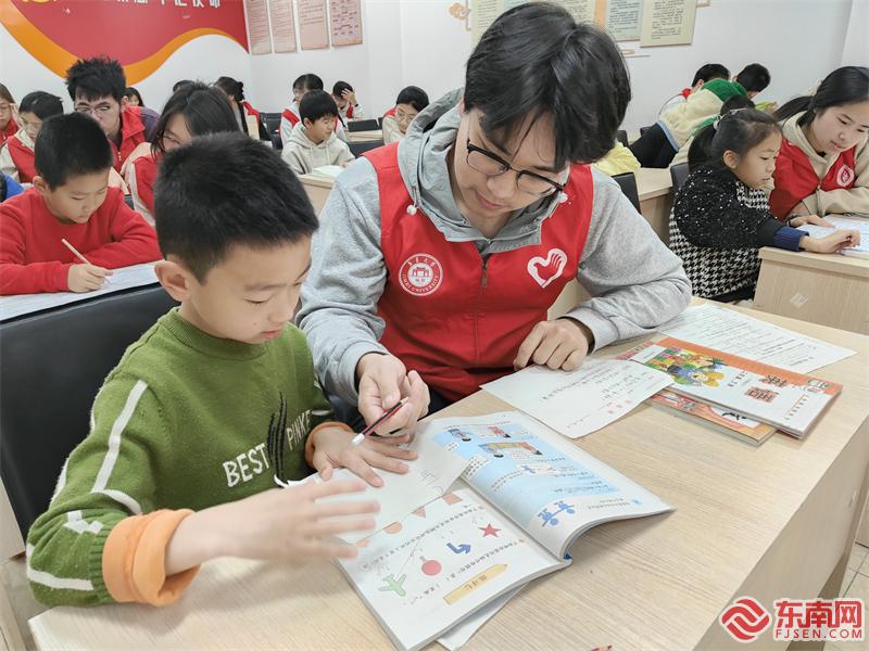 大學(xué)生志愿者為小朋友輔導(dǎo)作業(yè)(岑西社區(qū)新時(shí)代文明實(shí)踐站供圖)