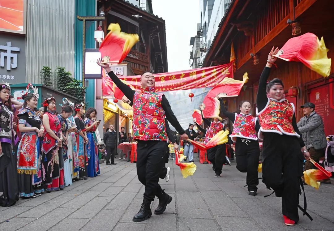 受邀參加此次活動的喜娘團(tuán)隊更是發(fā)揮她們的優(yōu)勢,滿面笑容、載歌載舞,將此次活動的喜慶氛圍推向高潮。其中,有一名走在隊伍最前面的喜公憑借極強(qiáng)的表現(xiàn)力和感染力賺足了群眾的眼球,同時也激發(fā)了群眾的好奇心。