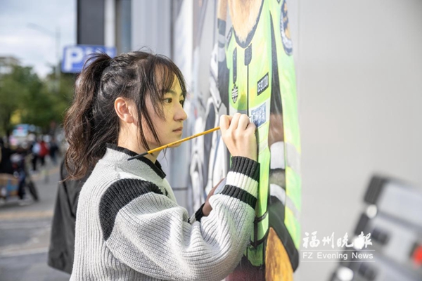林小燕正在繪制墻畫(福州晚報供圖)
