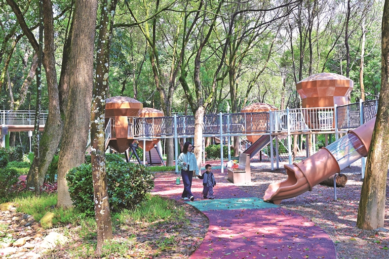 升級改造后的坂中森林公園,配有健康步道、健身器材、兒童娛樂設(shè)施、公共休憩桌椅和科普宣傳專欄等設(shè)施,道路兩旁灌木植被錯(cuò)落有致,松鼠靈活穿梭于樹枝之間,一派生態(tài)和諧的美好景象。很難想象,這里以前是一處被閑置許久、滿目荒蕪的公園。