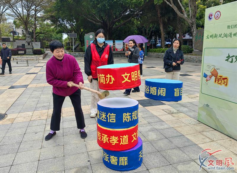 清明游園會也吸引眾多市民參與,樂享捶丸、“跳” 脫舊俗、文明轉(zhuǎn)轉(zhuǎn)樂、打敗壞風俗等游戲,將移風易俗知識融入其中。例如在“跳”脫舊俗游戲中,地面設(shè)置的跳房子互動道具不同格子內(nèi),寫有“天價彩禮”“大操大辦”“盲目攀比”等陳規(guī)陋習,參與者需根據(jù)游戲規(guī)則,以單腳跳躍、雙腳并跳的方式,回答移風易俗相關(guān)問題或朗讀文明新風做法等方式通過游戲關(guān)卡,在娛樂中加深對移風易俗的理解。