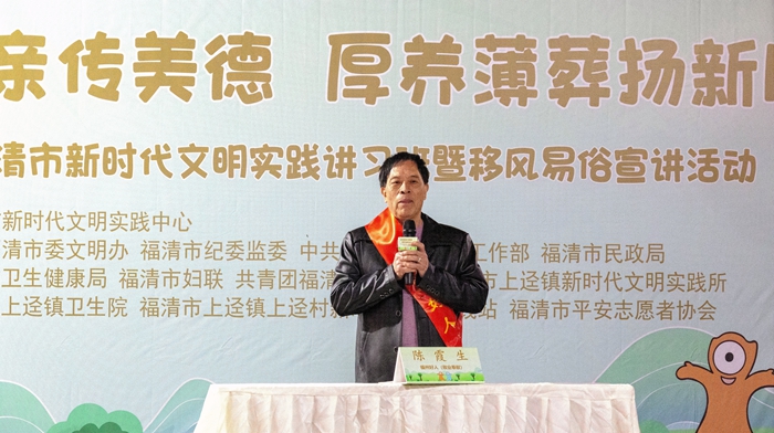 “福州好人”陳霞生進(jìn)行《孝老愛親傳美德 厚養(yǎng)薄葬揚新風(fēng)》主題宣講。 林毅騰 攝