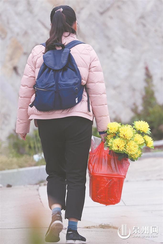 在宏福園墓區(qū),一對(duì)夫婦正用小掃帚打掃墓地上的灰塵。27歲的許女士來自豐澤區(qū),每年她都會(huì)來祭拜父親,今年她的丈夫陪同一起前來。擦凈墓碑后,二人用鮮花、彩帶“綠色祭掃”?!傲陥@大都位于山上,周圍有很多草木,燃燒金紙、放鞭炮容易起火。表達(dá)哀思的方式有很多,用鮮花和彩帶祭掃效果是一樣的。”