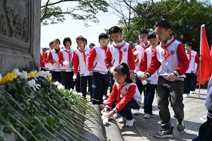 上午9時(shí),紀(jì)念碑前莊嚴(yán)肅穆。全體人員面向高聳的紀(jì)念碑列隊(duì)肅立,少先隊(duì)員行標(biāo)準(zhǔn)隊(duì)禮,全場(chǎng)齊唱國(guó)歌。隨后,全體人員默哀三分鐘,深切緬懷為民族獨(dú)立和人民解放事業(yè)獻(xiàn)身的革命先烈。