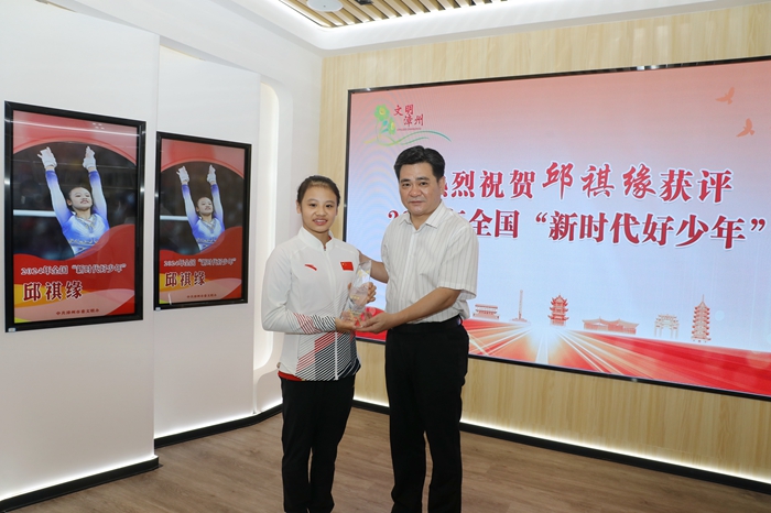 漳州市委宣傳部副部長、文明辦主任林偉強(qiáng)向邱祺緣轉(zhuǎn)授2024年全國“新時代好少年”獎杯