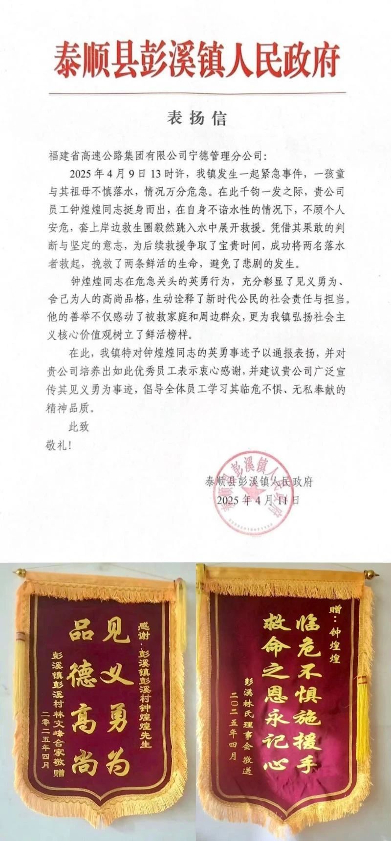 泰順縣彭溪鎮(zhèn)政府的感謝信,林氏理事會(huì)、林文峰一家送給鐘煌煌的錦旗。寧德高速公司供圖