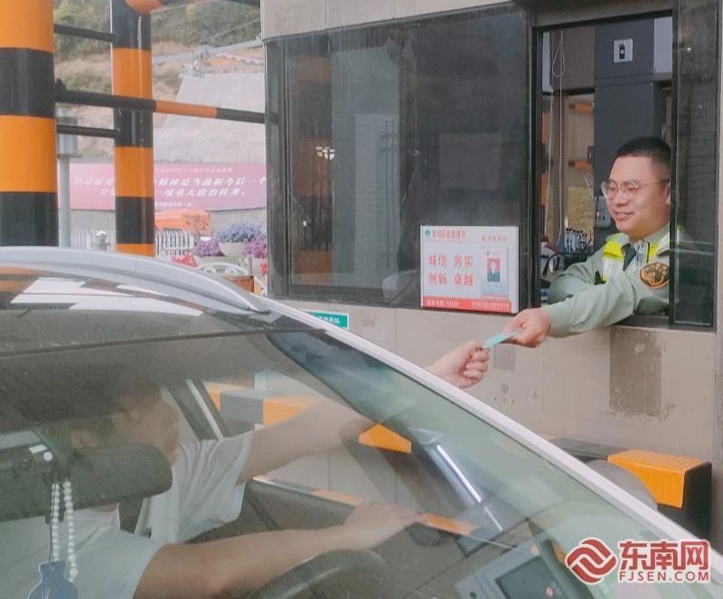 鐘煌煌在收費(fèi)站入口給司乘發(fā)卡。寧德高速公司供圖