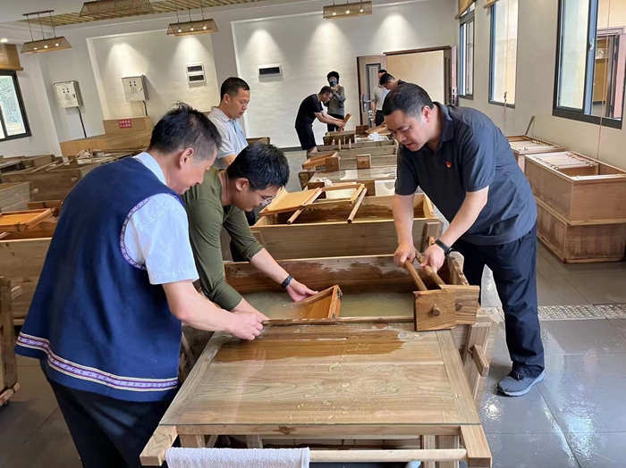 游客在寧化縣紙都治平館玉扣紙文化展館體驗玉扣紙造紙技藝