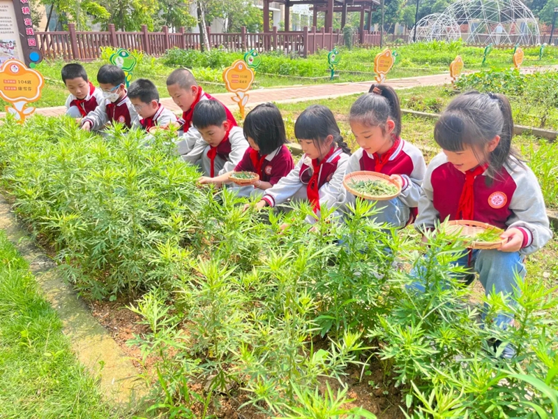 同學(xué)們在學(xué)校的中草藥勞動實(shí)踐基地采摘艾葉?;莅部h螺陽中心小學(xué) 供圖