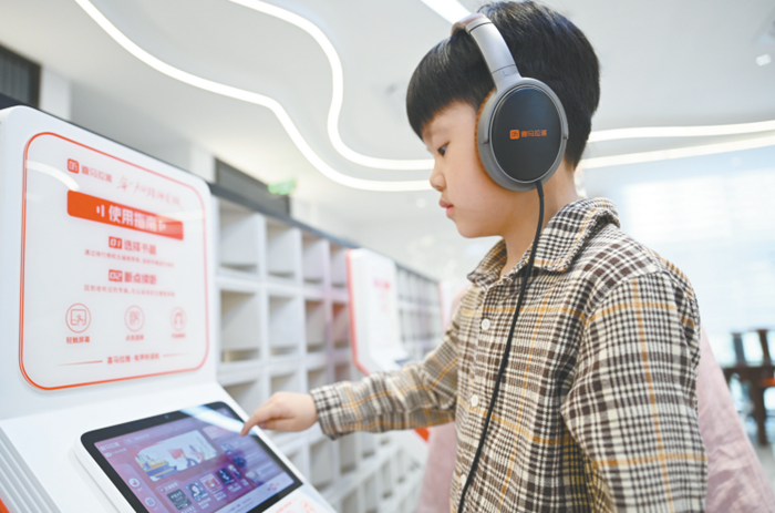 在實驗區(qū)圖書館,小朋友在選擇喜歡的有聲讀物。